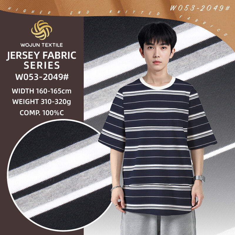 Foshan wojun textile co., ltd est un fabricant de tissu de tricot de milieu de gamme, haut de gamme dans plus de 100 ensembles de machines de tricot circulaires d'une capacité de plus de 8000 tonnes par an avec une usine 10,000 m2 et entrepôt de 3000 m2Nous avons plus de 25 ans d'expérience dans la production de tissus de tricot.tissus rayésNous sommes très attentifs à la qualité des tissus.